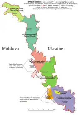 Das Gebiet steht unter entscheidendem russischen Einfluss,[6] so sind beispielsweise 1.200 bis 1.500 Soldaten der russischen Streitkräfte in Transnistrien stationiert, neben 10.000 bis 15.000 moskautreuen Paramilitärs.[5][7][8]