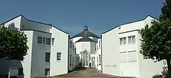 Der innere Bereich des Priesterseminars ist in einem schlichten Weiß ausgestaltet. Viele Fenster durchfluten das Gebäude mit Tageslicht.