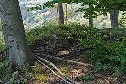 Von der Wehranlage sind nur spärliche Reste erhalten und es sind nur wenige Mauerreste sichtbar. Am rechteckigen Gipfelplateaus befand sich das Kernwerk der Burganlage, das im Osten durch einen mächtigen Abschnittsgraben mit einem dahinterliegenden und noch heute erkennbaren Wall geschützt wurde. Das Areal des Kernwerks war ursprünglich vermutlich von einer Ringmauer umgeben, deren verstürzte Reste man noch teilweise im Gelände erkennen kann. Im Südwesten war ein Torgebäude an die Ringmauer angebaut, von dem eine Mauer zum Kernwerk hochführte. Der Zugang führte von dort nach Osten in die Vorburg und erst von dort weiter in die Kernburg.[8] Der Zugang zur Kernburg erfolgte wahrscheinlich durch eine Toranlage im Nordosten. Südlich dieser Toranlage kann man die Reste eines Gebäudes erkennen. Im südlichen Teil der Kernburg wurden in den 1980er-Jahren die Fundamente von drei Räumen eines mehrteiligen Gebäudes freigelegt, die als Reste des Palas gedeutet werden.[8] Die Mauern dieses Gebäude haben an der Westseite ein kleinteiliges und lagiges Quadermauerwerk, das mit Bruchsteinen ausgeglichen wurde. Aufgrund des Mauerwerks lässt es sich dem 12. oder 13. Jahrhundert zuordnen. Der Ostteil des Gebäudes hat ein kaum lagerhaftes Bruchsteinmauerwerk, das heißt das die unterschiedlich großen Steine unregelmäßig verlegt wurden, weshalb es vermutlich aus dem 15. Jahrhundert stammen dürfte. Die freigelegten Räume hatten eine lichte Weite von etwa 5,5 Metern.[22] Etwas nordöstlich des Gebäudes befindet sich ein mächtiger Schuttkegel, der als möglicher Standort des Bergfrieds angesehn werden kann. Dies konnte aber mit den bisher erfolgten Grabungen aber nicht bestätigt werden.[3]