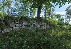 Östlich des Plateaus mit der Kernburg befindet sich ein weiteres, gegen Osten hin spitz zulaufendes Plateau. Dieses wird in der Forschung als Standort des Vorwerks der Anlage gedeutet. Die beiden Plateaus sind durch einen Abschnittsgraben mit östlich vorgelagerten Wall voneinander getrennt. Auch das Vorwerk war wahrscheinlich von einer Ringmauer umgeben. Mauerreste wurden aber nur im Norden der Anlage ergraben und sind im Südosten auch schwach im Gelände erkennbar. Die erforschten Mauerreste haben ein lagerhaftes und unregelmäßiges Bruchsteinmauerwerk, das sich nicht sicher datieren lässt, aber eher dem 15. Jahrhundert zugeordnet werden kann.[20] Den östlichen Abschluss des Plateaus bildet ein tiefer Spitzgraben mit vorgelagerten Wall, wobei es sich um die Reste einer Mauer handeln könnte.[8]