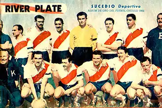 Die Meistermannschaft von CA River Plate (hintere Reihe von links: Norberto Yácono, Juan Carlos Spada, José Ramos, Amadeo Carrizo, Héctor Ferrari, Lidoro Soria; untere Reihe von links: Santiago Vernazza, Walter Gómez, Eliseo Prado, Ángel Labruna, Félix Loustau)