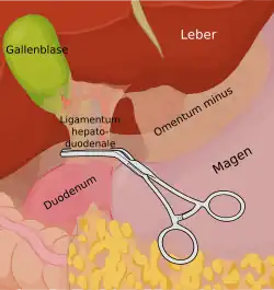 Das Pringle-Manöver ist eine von James Hogarth Pringle[1] entwickelte Maßnahme zur Unterbindung der Blutzufuhr bei operativen Eingriffen an der Leber. Dabei wird das Ligamentum hepatoduodenale, in dem die Pfortader (Vena portae) und die Arteria hepatica propria (Leberarterie) verlaufen, durch eine Gefäßklemme vorübergehend abgedrückt. Der ebenfalls im Ligamentum hepatoduodenale verlaufende Ductus choledochus wird dabei nach Möglichkeit ausgelassen. Ein Abklemmen wird über einen Zeitraum von bis zu 60 Minuten meist gut toleriert. Durch präischämische Konditionierung – vorheriges 2- bis 3-maliges Abklemmen über einen Zeitraum von 10 Minuten – kann die Toleranzzeit erhöht werden.[2] Alternativ besteht für längere Operationen die Möglichkeit, zwischenzeitlich die Durchblutung wiederherzustellen.[3]