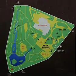 Später wurde auch die nordöstliche Hälfte mit einbezogen. Seitdem gehören die dortigen Sportanlagen (Tennisplätze und ein Baseball-Feld) zum Park. Auch die große Zentralbibliothek der Präfektur Tokio befindet sich im Park. Mit diesem, ebenfalls mit Bäumen bestandenen Teil beträgt die Gesamtfläche 67.131 m².