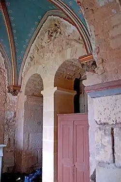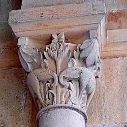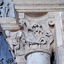 Die Gewölbe des Portalvorbaus enden im Inneren überwiegend auf Pfeilern mit alten halbrunden Diensten, deren Kapitelle mit Tannenzapfen und Knospen, Blattwerk und Blüten geschmückt sind. Es sind überwiegend dekorative Motive, die aber auch einen tieferen symbolischen Sinn aufweisen können, ganz wie die Elefanten, Sinnbild von Kraft, vereint mit Geduld, oder die Jakobsmuscheln, die an den Pilgerweg nach Santiago erinnern.