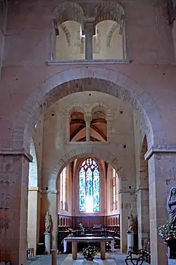 Die Anlage der das Chorjoch begleitenden Seitenschiffe erinnert sehr an das oder die ersten Joche eines Umgangschors, welcher den Baumeistern der frühen Romanik durchaus bekannt und vor allem für Pilgerkirchen von Bedeutung war. Vielleicht hatten die Baumeister dieser Kirche bereits eine spätere Erweiterung um einen solchen Chor mit Umgang im Sinn.