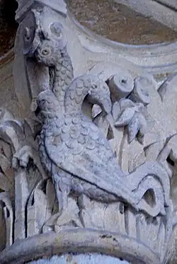 Das Kapitell über der rechten Portalsäule ist besser erhalten. Seine Darstellungen sind allerdings rätselhaft. Die Hauptfigur in der Mitte ist ein gewaltiger Vogel mit drei Köpfen auf langen Hälsen, von denen ein Kopf verloren ist. Zwei von ihnen waren vorwärts gerichtet und einer nach hinten. Er steht aufrecht nach links gewandt auf seinem linken Bein mit kräftigen Krallen und erhebt sein rechtes Bein in verteidigender Haltung.