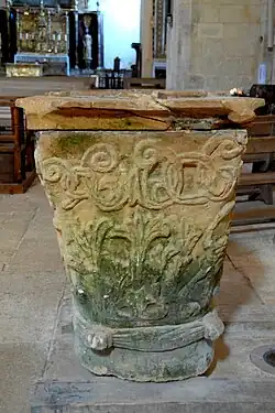 Zu den besonderen Sehenswürdigkeiten im Innern des Kirchenraumes zählt ein massives, kelchartiges Taufbecken, ein Monolith mit romanischer Reliefskulptur.