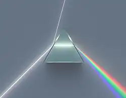 Wird das lichtwellenlängenabhängige (dispersive) Verhalten des Materials eines Prismas ausgenutzt, wird es als Dispersionsprisma bezeichnet. Diese werden z. B. in Prismenspektrometern eingesetzt. Dabei fällt das Licht schräg auf eine Seitenfläche des Prismas, im einfachsten Fall auf ein Prisma in Form eines gleichschenkligen Dreiecks. Durch den schrägen (genauer nicht-senkrechten) Einfall und den für jede Wellenlänge spezifischen Brechungsindex werden die verschiedenen Wellenlängen in einem jeweils anderen Winkel an der Grenzfläche gebrochen. Dieser Effekt tritt erneut an der Austrittsfläche des Prismas auf, wo der aufgespaltene Lichtstrahl in unterschiedlichen Winkeln auftrifft, wodurch sich die Brechung und damit die Aufspaltung noch weiter verstärken. Die gemeinsame Kante der beiden beteiligten Flächen (im Diagramm oben) heißt die ablenkende oder brechende Kante, bezüglich der das Licht in die Gegenrichtung abgelenkt wird.