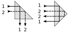 Die Hauptanwendungen des Prismas beruhen typischerweise entweder auf seiner Eigenschaft, Licht wellenlängenabhängig zu brechen – das ist dann »Dispersion« – oder darauf, Lichtstrahlen durch Reflexion an einer oder an mehreren Flächen umzulenken, etwa im Sucher einer Spiegelreflexkamera.[1] Dabei kommen sowohl Totalreflexion als auch gerichtete Reflexion an mit Metall beschichteten Prismenflächen zum Einsatz.