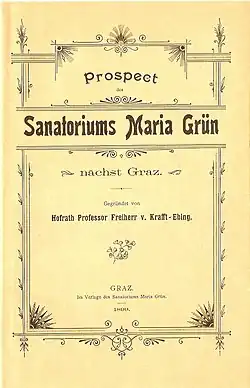 Wie einem „Prospect des Sanatoriums Maria Grün nächst Graz“ aus dem Jahr 1899 zu entnehmen ist, hatte das Sanatorium die Bestimmung, „Nervenleidenden aus den höheren Classen der Gesellschaft all dasjenige zu bieten, was zu ihrer Pflege und Heilung nach dem gegenwärtigen Stande medicinischer Wissenschaft erforderlich ist. Bei unbedingtem Ausschlusse geistig Gestörter stellt sich das Sanatorium die Aufgabe, praktisch das zu verwirklichen, was der Begründer Hofrath Professor Freiherr v. Krafft-Ebing, in seinem Buche „Über gesunde und kranke Nerven“ (4. Auflage bei Laupp in Tübingen) als Erfordernisse für eine erfolgreiche Behandlung Nervenkranker bezeichnet hat. Speziell zur Aufnahme eignen sich die vielgestaltigen Krankheitszustände der Neurasthenie (Hypochondrie), Hysterie, nervöse Erschöpfungs- und Reizzustände nach acuten schweren Krankheiten, Wochenbetten usw., sowie Affectionen der peripheren Nerven (Neuralgien, Spinalirritation usw.). Auch werden Entziehungscuren bei Morphinismus, Cocainismus und anderen chronischen Intoxicationen durchgeführt.“