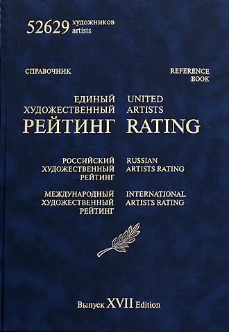 - Die Künstlergewerkschaft Russlands veröffentlicht regelmäßig das Nachschlagewerk United Art Rating (vor 2012 „United Artists Rating“) und es erscheint seit 1999 als periodisches Nachschlagewerk, registriert als Massenmedium. Im Mai 2018 war der Stand 23 gedruckte Ausgaben, die Gesamtzahl der gedruckten Exemplare beträgt mehr als 90.000.[3][4] Die elektronische Version ist ebenfalls verfügbar.[5] Am 1. Januar 2016 umfasste United Art Rating die Namen, Lebensdaten und Bewertungskategorien von 58.965 Künstlern (Malern, Grafik- und Plakatkünstlern, Theaterdekorateuren, Batikmalern, Illustratoren, Filmanimatoren, Bildhauern, Juwelieren, Keramikern, Installationskünstlern etc.).