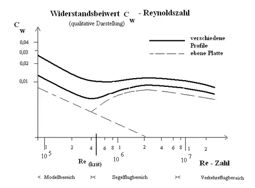 Dabei ergibt sich Folgendes: im kleinen Geschwindigkeitsbereich und bei laminarer Strömung () nimmt der -Wert mit ansteigender Reynolds-Zahl ab. Dies ist erklärbar mit der zunehmend größer werdenden Energie der Strömung, die es ihr ermöglicht, dem Flügelprofil länger zu folgen und den Ablösepunkt entlang der Profiloberfläche nach hinten zu verschieben. Die turbulente Wirbelschleppe hinter dem Profil wird kleiner und verringert ihren Einfluss auf den Reibungswiderstandsbeiwert.