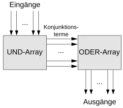 Einfache programmierbare logische Schaltungen bestehen meist aus einem Array aus UND-Verknüpfungen gefolgt von einem Array aus ODER-Verknüpfungen.