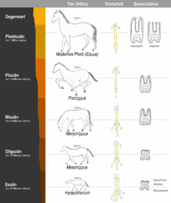 Am Beginn der Entwicklung stehen Formen wie das etwa fuchsgroße, vierzehige Hyracotherium (früher „Eohippus“). Die Entwicklung geht über viele Zwischenformen (z. B. Mesohippus, Merychippus, Pliohippus) zum rezenten einzehigen Pferd (Equus).