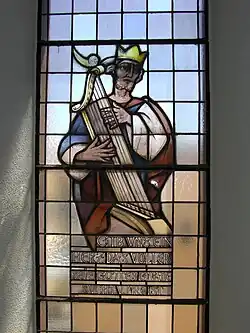 König David mit Harfe und ein Engel mit Posaune als weitere Emporenfenster verweisen auf kirchenmusikalische Aktivitäten in dem Kirchenraum.