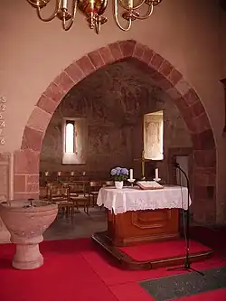 Kunsthistorisch am wertvollsten ist das Untergeschoss des Turms. In dem quadratischen Chorraum aus dem Mittelalter finden sich romanische Wandmalereien in Fresco-Secco-Technik aus der Mitte des 13. Jahrhunderts, die erst bei der Renovierung im Jahr 1964 wieder freigelegt wurden.