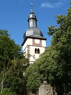 Darum gelegen ist der Friedhof mit altem Baumbestand, zwei Kriegerdenkmälern und Grabsteinen aus mehreren Jahrhunderten.
