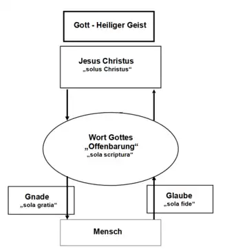Prägend sind die Konzentration auf die Bibel, die Anerkennung Jesu Christi als alleiniger Autorität für die Kirche und den einzelnen Glaubenden sowie die Lehre, dass der Mensch „allein aus Gnade“ – und nicht aufgrund seines Handelns – errettet wird. Rechtfertigung erfährt der Mensch „allein durch den Glauben“. Entsprechend wird der Ablass (Nachlass zeitlicher Sündenstrafen gegen Geld, Bußübungen oder andere gute Werke) abgelehnt.