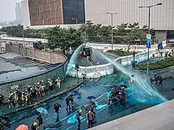 Am Neujahrstag 2020 fanden erneut Demonstrationen mit mehreren hunderttausend Teilnehmern statt.[97] Am 19. Januar fand im Central District eine Demonstration unter dem Motto „Universal Siege against Communism“ („Allgemeine Belagerung gegen den Kommunismus“) statt. Die Organisatoren sprachen von 150,000 Teilnehmern, während die Polizei eine Schätzung von maximal 11,680 Teilnehmern gab. Im Verlauf der Demonstration verließ ein Teil der Teilnehmer den für die Demonstration genehmigten Bereich, den Chater-Garden-Park, und baute vorübergehend Barrikaden aus Regenschirmen, Leitkegeln und anderen Gegenständen auf angrenzenden Straßen; außerdem gruben sie Pflastersteine aus. Bei der daraufhin erfolgenden Auflösung der Demonstration durch die Polizei kam es zu Ausschreitungen, bei denen die Polizei Tränengas einsetzte und mehrere Polizisten verletzt wurden. Die Polizei nahm den bekannten Aktivisten Ventus Lau fest mit der Begründung, er habe als Organisator der Demonstration die Verletzung der Demonstrationsauflagen zu verantworten sowie sich gegen polizeiliche Maßnahmen gestellt.[98]