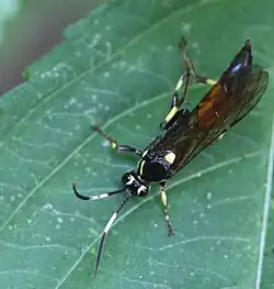 Die relativ großen Schlupfwespen sind etwa 20 mm lang. Die Färbung, insbesondere des Hinterleibs und der Beine ist variabel. Die Art wird in mindestens 4 Unterarten gegliedert.[2] Kopf und Thorax der Weibchen sind überwiegend schwarz gefärbt. Entlang dem Innenrand der Facettenaugen verläuft ein breiter weißlich-gelber Längsstreifen. Die Fühler weisen auf halber Länge eine breite weiße Binde auf. Entlang des Pronotums verläuft seitlich ein weißlich-gelber Strich. Unterhalb des Ansatzes der Vorderflügel befindet sich ein weißlich-gelber Fleck. Das Scutellum ist ebenfalls weißlich-gelb. Der Hinterleib ist orange gefärbt. Die hinteren Tergite sind meist schwarz. Der sehr kurze Ovipositor ist am Hinterleibsende zu erkennen. Die Beine sind bis auf die Tibien und Tarsen schwarz. Die apikalen Enden der zum Teil weißlich-gelb gefärbten Tibien sind gewöhnlich schwarz. Die Vorderflügel besitzen ein schmales Pterostigma.