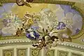 In den Deckenfresken des Prunksaals spiegelt sich u. a. wider, dass die Bücher thematisch aufgeteilt wurden nach dem Kriterium, ob sie dem Themenkreis des Kriegs (Bereich am Eingang, nahe dem Augustinerlesesaal) oder jenem des Friedens (Bereich an den Redoutensälen) zuzuordnen sind.[5] Die Fresken stammen von Daniel Gran und wurden von 1726 bis 1730 gemalt. Das Fresko in der Mittelkuppel stellt die Apotheose Karls VI. dar, dessen Bild von Herkules und Apoll gehalten wird.[5] Um das Bild des Kaisers sind in einem komplizierten Programm allerlei allegorische Figuren versammelt, die die Tugenden der Habsburger und den Reichtum ihrer Länder symbolisieren sollen. Das Herrschaftsprogramm schuf der Hofgelehrte Conrad Adolph von Albrecht.[5] Ferner zeigen die Fresken die allegorische Geschichte der Erbauung der Hofbibliothek. Das Deckenfresko von Gran wurde von Franz Anton Maulbertsch restauriert.