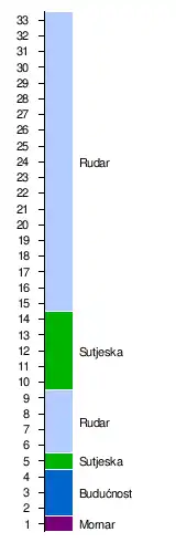 | 1. | FK Rudar Pljevlja | 33 | 22 | 6 | 5 | 58:18 | +40 | 72 |