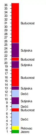 | 3. | FK Arsenal Tivat (N) | 36 | 13 | 11 | 12 | 39:39 | ±0 | 50 |