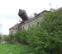 - moderne Kirche in Ostrów, alter Obelisk (Kreuz über Halbmond)