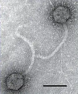 Beispielsweise sind die HS6-ähnlichen Phagen modulare Hybride, die aus einem Siphovirus-ähnlichen, nicht kontraktilen „Schwanz“ bestehen, der mit einem Myovirus-Mu-ähnlichen „Kopf“ (Kapsid) verschmolzen ist.[43] Die folgenden Zuordnungen zu Morphotypen sind daher eher tentativ zu verstehen: