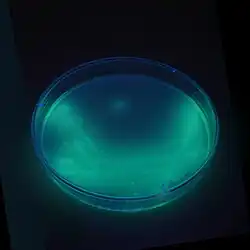 Der Nonfermenter P. aeruginosa ist unter anaeroben Bedingungen in der Lage, Fermentation zu betreiben. Es werden Pyruvat oder Arginin fermentiert.[5][6] Als wichtiger Denitrifizierer ist es ebenfalls in der Lage, unter anaeroben Bedingungen und dem Zugang zu Stickoxiden diese als terminale Elektronenakzeptoren in der anaeroben Atmung zu nutzen. Die Fähigkeit zur Denitrifikation und die Eigenschaft, Biofilme zu bilden, sind für P. aeruginosa wichtige Virulenzfaktoren (siehe Mukoviszidose).[7] In verschiedenen Nährmedien (z. B. Cetrimid-Agar) setzt es Farbstoffe wie Pyocyanin, Pyoverdin, Pyorubin und Pyomelanin frei. Meist ist es auf Agar „metallisch-grün“ glänzend. Charakteristisch ist dabei ein als „lindenblüten-“ oder „traubenartig“ beschriebener süßlicher Geruch („Gummibärchengeruch“), der auf die Produktion von 2-Aminoacetophenon (2-AA) zurückzuführen ist. Unter anderem wegen seiner Flüchtigkeit ist 2-AA ein potentieller, für P. aeruginosa selektiver Biomarker im Zusammenhang einer Infektion bei Mukoviszidosepatienten.[8] Außerdem scheint es Fliegen anzulocken und die Besiedlung ihres Darms zu unterstützen, ohne jedoch dabei deren Sterblichkeit zu erhöhen, wodurch es die Verbreitung von P. aeruginosa erleichtert.[9]
