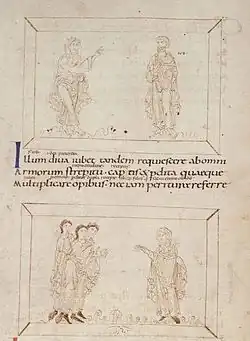 - ↑ Helen Woodruff: The Illustrated Manuscripts of Prudentius. Cambridge, Mass.: Harvard UP, 1930, S. 34f. und passim; zu den hier abgebildeten Handschriften, S. 38f.