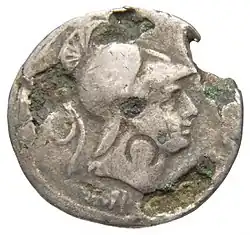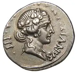 - ↑ Herbert Appold Grueber: Coins of the Roman Republic in the British Museum. Band 2. British Museum, London 1910, S. 60, Nr. 4513 (Coins of the Roman Empire in the British Museum Nr. 6; The Roman Imperial Coinage Nr. 109). Variante mit „OB. C. S.“ (Bibliothèque Nationale, Catalogue des monnaies de l’Empire romain Nr. 108, 109a): Herbert Appold Grueber: Coins of the Roman Republic in the British Museum. Band 2. British Museum, London 1910, S. 60, Nr. 4512 mit 2 Varianten (Obvers A) Liber und B) Feronia); Abb. in Herbert Appold Grueber: Coins of the Roman Republic in the British Museum. Band 3. British Museum, London 1910, Tafel LXVI Nr. 1; Jean-Baptiste Giard: Catalogue des monnaies de l’empire romain. I. Auguste. Bibliothèque nationale de France, Poinsignon numismatique, Paris 1976, Nr. 108–109) Umzeichnung in Herbert Appold Grueber: Coins of the Roman Republic in the British Museum. Band 2. British Museum, London 1910, S. 61. Motiv auch bei Aquillius (Herbert Appold Grueber: Coins of the Roman Republic in the British Museum. Band 3. British Museum, London 1910, Tafel LXVI Nr. 16), und Durmius (Herbert Appold Grueber: Coins of the Roman Republic in the British Museum. Band 3. British Museum, London 1910, Tafel LXVII Nr. 5).