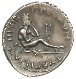 - ↑ Bibliothèque Nationale, Catalogue des monnaies de l’Empire romain Nr. 140-146; Coins of the Roman Empire in the British Museum Nr. 18,19 u. 21; The Roman Imperial Coinage Nr. 101-103; Abb. in Herbert Appold Grueber: Coins of the Roman Republic in the British Museum. Band 3. British Museum, London 1910, Tafel LXVI Nr. 5–7; Jean-Baptiste Giard: Catalogue des monnaies de l’empire romain. I. Auguste. Bibliothèque nationale de France, Poinsignon numismatique, Paris 1976, Nr. 140–144. Motiv auch bei Aquillius (Herbert Appold Grueber: Coins of the Roman Republic in the British Museum. Band 3. British Museum, London 1910, Tafel LXVI Nr. 19; Jean-Baptiste Giard: Catalogue des monnaies de l’empire romain. I. Auguste. Bibliothèque nationale de France, Poinsignon numismatique, Paris 1976, Nr. 177–178) und mit anderem Bild (Herbert Appold Grueber: Coins of the Roman Republic in the British Museum. Band 3. British Museum, London 1910, Tafel LXVI Nr. 20).