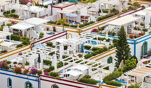 Puerto de Mogán entstand in den 1980er-Jahren nach einem Entwurf von Rafael Neville.[1] Der Ort wird aufgrund einiger Kanäle, die vom Hafen in den Ort führen, zuweilen auch als „Klein Venedig“ oder das „Venedig des Südens“ bezeichnet. Die zahlreichen kleinen Gassen, die sich durch den Ort ziehen, tragen zu dem Erscheinungsbild bei. Im Zuge der wachsenden Bedeutung des Tourismus wurde viel gebaut, wobei Anstrengungen unternommen wurden, durch postmoderne Architektur einen Teil des ursprünglichen Charmes zu erhalten.[2] Die Gemeindeverwaltung hat verboten, in Puerto de Mogán Häuser zu bauen, die mehr als zwei Stockwerke hoch sind. So ist das frühere Fischerdorf in seinem Ursprung trotz Tourismus weitgehend erhalten geblieben und der neue Teil fällt nicht sofort als solcher auf.