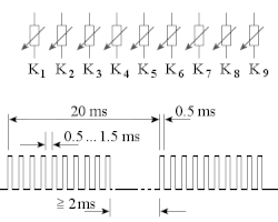 Im RC-Modellbau werden meist acht Werte/Stellungen/Größen pro Sequenz per Funk übertragen. Die acht Pausen befinden sich zwischen 9 Impulsen von 0,5 ms Dauer und üblicherweise einem (TTL) Pegel von 5 V. Jede Pause ist 0,5 bis 1,5 ms lang. Das Basisbandsignal wird per binärem Shift-Keying auf einen Träger aufmoduliert.