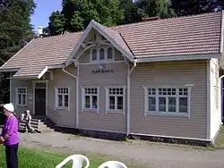Die Eisenbahnstrecke von Parikkala über Punkaharju nach Savonlinna wurde 1908 fertiggestellt. 1906 bis 1908 entstand das Bahnhofsgebäude[4] nach Plänen des Architekten Bruno Granholm. Als wichtigster Bahnhof in der Umgebung des Punkaharju erhielt er dessen Namen Bahnhof Punkaharju. Das Hauptgebäude im Jugendstil ist weitgehend originalgetreu erhalten. Die Gestaltung und Ausstattung des Bahnhofs, einiger Nebengebäude und seiner Umgebung ist weitaus repräsentativer als es bei finnischen Bahnhöfen dieser Zeit und dieser Größe üblich war. Jugendstil-Dekorationen nehmen Elemente karelischer Volkskunst auf. Das Holzgebäude steht auf einem massiven Natursteinsockel. Der Bahnhof liegt in einem Park und wird über eine 270 m lange Lindenallee erschlossen. Maßgeblich für die repräsentative Architektur war die Nachbarschaft der gehobenen Tourismusziele: Valtionhotelli, die Villa der Zarin, Finlandia, das Kruunupuisto. Diese Ziele konnten lange Zeit nur über diesen Bahnhof bequem erreicht werden. Das gesamte Ensemble ist kultur- und architekturhistorische bemerkenswert. 1993, 1994 und 2005 wurde der Bahnhof behutsam restauriert und renoviert.
