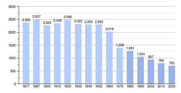 Durch Fortzug in die umliegenden Städte ist die Bevölkerung seit den 1950er Jahren stetig gesunken.