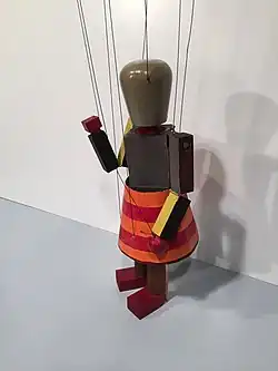 Im Rahmen der Kunstschule Staatliches Bauhaus entstanden Puppen im Bauhaus in unterschiedlichen Puppengenres. Dabei gilt es zu unterscheiden zwischen Puppen für künstlerische Darstellungen, wie beispielsweise im Marionettentheater, und Puppen, die als Spielzeug gedacht waren. Viele Bauhäusler versuchten sich in der Kunst der Puppenherstellung.[1] Derart entstanden zweidimensionale Puppen für Bühnenspiele, Handpuppen, Stabpuppen, Marionetten und Wurfpuppen. Bei Bauhausfesten verkleideten sich die Künstler häufig mit Masken oder Kostümen, die aus der Puppenwelt inspiriert wurden.[1]