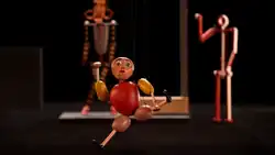 - Marionette Der Arzt: Sowohl in Formen- als auch Farbgebung folgt diese Figur ganz dem Stil des Bauhauses. Die Marionette ist schwer zu spielen wegen der zahlreichen Gelenke und der langen Spitzen/Spritzen in den Händen, die sich in den Fäden verfangen. Die Rückseite ist schwarz angemalt. Die Puppe erinnert an den zeitgenössischen rotblauen Stuhl von Gerrit Rietveld.[10]