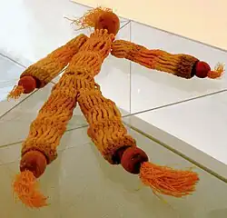 Die sogenannten Wurfpuppen gestaltete Alma Siedhoff-Buscher für Kinder.[19] Die Puppen haben einen Kopf aus Holz mit einem schlicht gemalten Gesicht aus geometrischen Formen.[20] Der wirre Haarschopf besteht aus Bast.[19] Die langen Gliedmaßen sind ebenfalls aus Bastmaterial, geflochten und mit jeweils einer Holzkugel als Abschluss.[20] Die Kleidung ist aus Chenillegarn[4] gestrickt. Die Puppen zeichnen sich durch ihre Robustheit und die vielfältigen Bewegungsmöglichkeiten der schlacksigen Gliedmaßen aus.[19]