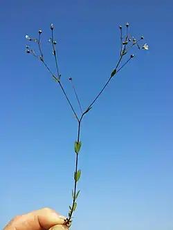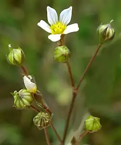 Die Blütenstände sind Dichasien. Die Blüten haben einen Durchmesser von 4 bis 5 Millimeter; vor dem Aufblühen sind sie nickend. Die Blütenstiele sind länger als ihre Tragblätter und kahl. Die Blüten sind fünfzählig. die Kelchblätter sind 2 bis 3 Millimeter lang, von schmal elliptischer Gestalt, am Ende zugespitzt, einnervig und am Rand drüsig bewimpert. Die Kronblätter sind (3 bis) 4 bis 5 (bis 6) Millimeter lang. Ihre Farbe ist weiß mit gelbem Grund. Die Staubblätter sind rund 2 Millimeter lang. Der Fruchtknoten trägt fünf eiförmig-kopfige Narben auf rund 0,5 Millimeter langen Griffeln.