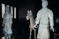- militärische Stärke. Durch die ständige Auseinandersetzung mit den Nomaden durch die Reformen von General Wei Ran verfügte Qin über ein ausgebildetes und schlagkräftiges Heer.[25] Außerdem ermöglichte die damals gerade eingeführte Registrierung aller Haushalte eine effiziente Rekrutierung von Soldaten. Theorien, dass Qin auch aufgrund von Vorsprüngen bei der Eisenbearbeitung militärische Vorteile gehabt haben könnte, werden von archäologischen Funden jedoch entkräftet; die gefundenen Waffen sind zum größten Teil aus Bronze gefertigt, das damals überwiegend gegossene Eisen war hingegen weich und brüchig. Da in die Zeit des Aufstieges des Qin-Staates auch der Übergang von Streitwagen- zu massiven Infanterieheeren kombiniert mit dem Einsatz von Armbrustschützen als dominierende Form der Kriegsführung fiel, war die Fähigkeit der Verwaltung, kurzfristig Streitkräfte zu rekrutieren, entscheidend.[26][27]