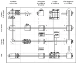 Die Struktur des QFD nach Yoji Akao besitzt vier horizontale Ebenen, die von oben nach unten eine zunehmende Konkretisierung aufweisen: