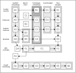 Im Bild ist die Matrix der Matrizen von Bob King dargestellt, die Spalten A bis D (Qualitätsentwicklung, Spezialcharts, Technologieentwicklung und Zuverlässigkeitsentwicklung) entstammen dem Ansatz von Yoji Akao. Die Spalten E (Neue Konzepte) und F (Hilfsmethoden) sowie die Zeile fünf (Prozessentwicklung) sind von Bob King eingebrachte Neuerungen, worin die Prozessentwicklung (G1 bis G6) durch einen gestrichelten Rahmen und die Konzeptplanung (Neue Konzepte) von S. Pugh durch eine graue Hinterlegung gekennzeichnet ist.