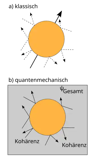 Zur Veranschaulichung dieses Effektes sei das Beispiel eines makroskopischen Objekts betrachtet, das dem Einfluss einer isotropen Lichtstrahlung – im Folgenden auch als Umgebung bezeichnet – ausgesetzt ist.[18] Im Rahmen der klassischen Physik ist der Einfluss des einfallenden Lichts auf die Bewegung des Objekts vernachlässigbar, da der mit dem Stoß eines Photons verbundene Impulsübertrag sehr gering ist und sich die Stöße aus verschiedenen Richtungen im Mittel kompensieren. Bei quantenmechanischer Betrachtung findet bei jedem Stoß eine Verschränkung des Objekts mit einem Photon statt (siehe oben), sodass das Objekt und das Photon nun als ein erweitertes Gesamtsystem betrachtet werden müssen. Die für Interferenzeffekte entscheidenden festen Phasenbeziehungen des quantenmechanischen Zustands erstrecken sich nun also über zwei Teilsysteme, das Objekt und das Photon, man spricht auch von einer Delokalisierung der Kohärenz.