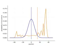 Ein diskreter Quantum Walk wird durch eine Münze und einen Verschiebungsoperator spezifiziert, die wiederholt angewendet werden. Das folgende Beispiel soll dies illustrieren.[6] Man stelle sich ein Partikel mit einem Spinfreiheitsgrad eines Spin--Teilchens auf einer Linie (einem eindimensionalem Modell) vor. Sein Zustand kann als Produkt eines Spinzustandes (Eigenzustände der z-Komponente des Spin-Operators mit Eigenwert („Spin hoch“) und („Spin runter“)) und einer Spinposition beschrieben werden. Bei dem Produkt dieser Zustände handelt es sich um das Kronecker-Produkt, welches die beiden Freiheitsgrade separiert. Der Raum der Spinzustände wird Münzraum genannt. Ein bedingter Sprung des Partikels auf der Linie wird durch folgenden Operator beschrieben: . Das Partikel springt bei Spin hoch also nach rechts und bei Spin runter nach links. Wendet man beispielsweise die bedingte Sprungoperation auf einem Initialzustand an, führt das zum Zustand . Rotiert man den Spin zuerst mithilfe einer unitären Transformation in , und wendet dann an, erhält man eine zufällige Bewegung auf der Linie. Als Transformation kann zum Beispiel die Hadamard-Münze gewählt werden: . Wenn der Spin zu diesem Zeitpunkt gemessen wird, erhält man entweder einen Spin hoch an der Stelle 1 oder einen Spin runter an der Stelle -1. Wiederholte Anwendung der Prozedur würde einem klassischen Walk entsprechen, zum Beispiel einem Galtonbrett. Die Idee des Quantum Walk ist allerdings, zwischen den Wiederholungen der Spin-Rotation und des bedingten Springens nicht zu messen (sodass kein Kollaps der Wellenfunktion stattfindet). Auf diese Weise bleibt die Quantenverschränkung erhalten (d. h. die nicht kollabierten Wellenfunktionen) und verschiedene Positionen können miteinander interferieren. Dies führt zu einer drastisch unterschiedlichen Wahrscheinlichkeitsverteilung im Vergleich zum klassischen Walk (Gaußverteilung), wie in der Abbildung rechts deutlich wird. Insbesondere ist erkennbar, dass die Verteilung nicht symmetrisch ist: Obwohl die Hadamard-Münze mit gleicher Wahrscheinlichkeit Spin hoch und Spin runter liefert, tendiert die Verteilung nach rechts, wenn initial ein Spin hoch vorliegt. Dieser Effekt lässt sich grob gesprochen dadurch erklären, dass die Hadamard-Münze mehr destruktive Interferenz für Positionen auf Wegen nach links als nach rechts liefert. Eine symmetrische Verteilung ist möglich mithilfe einer geeigneten Münze oder einem Initialzustand wie , da die Hadamard-Münze keine komplexen Zahlen einführt, sodass Spin hoch und Spin runter sich hier nicht verschränken.