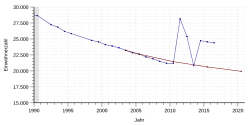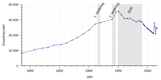 68. Einwohnerzahl jeweils zum 31. Dezember, außer zum 17. Mai 1939, 29. Oktober 1946 und 10. Oktober 1990. Die Zahlen zum Jahr 1950 wurden an unterschiedlichen Monaten erhoben und werden mit 35.426 bzw. 35.555 angegeben.
