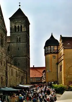 Von der weiteren reichspolitischen Bedeutung Quedlinburgs im 11. und 12. Jahrhundert zeugen die vor Ort verfassten, später so genannten Quedlinburger Annalen. Diese verzeichnen im Jahre 1009 erstmals in schriftlichen Quellen Litua, den Namen Litauens. Für die Zeit vom 10. bis zum 12. Jahrhundert, als Quedlinburg die Osterpfalz der ostfränkisch/deutschen Herrscherhäuser war, sind 69 urkundlich nachweisbare Aufenthalte eines Königs oder Kaisers gezählt worden.[25]