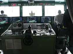 Die Brücke der Queen Mary 2 befindet sich auf Deck 12 in einer Höhe von ca. 41 m über dem Wasser und erstreckt sich über eine Breite von ca. 45 m. Dies ermöglicht eine Sichtweite von etwa 25 km.[28] Daten von Radar, Navigation, Sicherheitssystemen, Schiffstechnik und Wetter werden auf Flachbildschirmen dargestellt. Das Schiff kann mit einem einzelnen Joystick gesteuert werden. Auf See wird die Queen Mary 2 wie alle modernen Großschiffe von einer mit GPS navigierenden Selbststeueranlage gelenkt. Zusätzlich verfügt das Schiff über DP (Dynamische Positionierung).