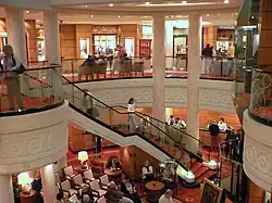 Den Zugang zum Schiff bildet die „Grand Lobby“ mit einem großen Treppenhaus. In unmittelbarer Nähe befindet sich auch das Spielcasino. Das Einkaufszentrum mit einer Fläche von über 500 m² erstreckt sich auf der zweiten Ebene. Von der Lobby führen großzügig gestaltete Gänge zu den öffentlichen Bereichen auf den Decks 2 und 3. An Bord befinden sich über 300 Gemälde mit einem Gesamtwert von etwa fünf Millionen Euro. In Tradition der Reederei Cunard sind darunter auch Porträts der britischen Königsfamilie.